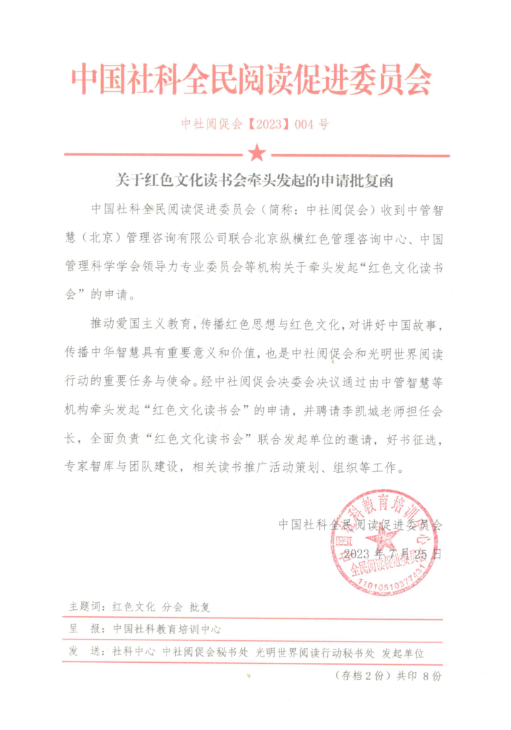 为了能够弘扬“红色文化及红色管理思想”,促进中国特色哲学社会科学体系建设,中管智慧(北京)管理咨询有限公司联合北京纵横红色管理咨询中心、中国管理科学学会领导力专业委员会等机构向中国社科全民阅读促进委员会、光明世界阅读行动提出牵头发起“红色文化读书会”的申请获得批复。